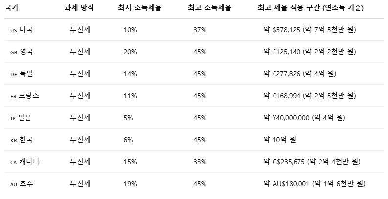 국가별 소득세율은 세금 부과 방식과 소득 구간별 세액에 따라 차이가 있습니다. 아래 표는 각국의 대표적인 소득세율 구조를 비교한 것입니다.