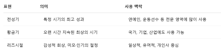 - 일반적 의미: 인생에서 가장 빛났던 시기, 외모나 인기가 절정이었던 시절을 뜻함