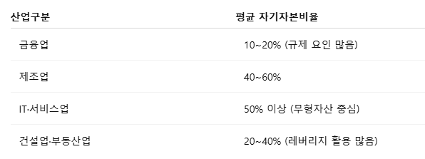 따라서 동일한 자기자본비율이라 하더라도 산업별 특성을 고려해 해석해야 합니다.